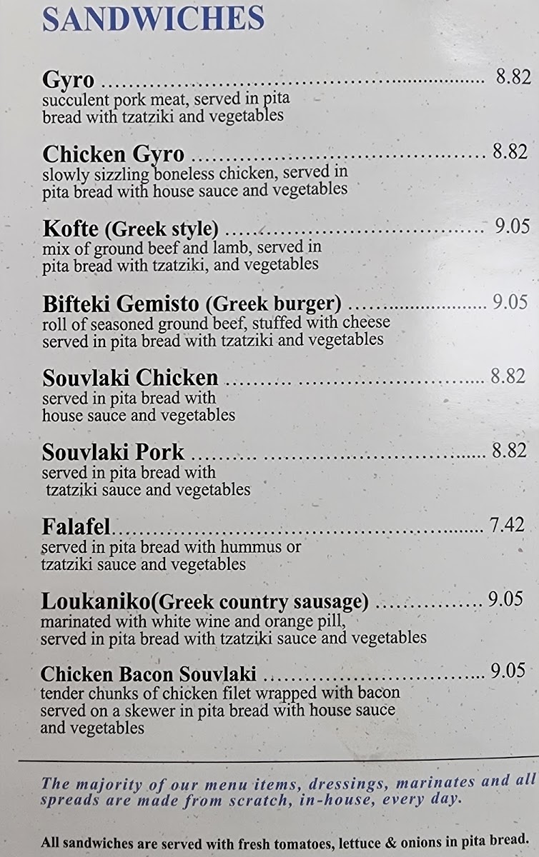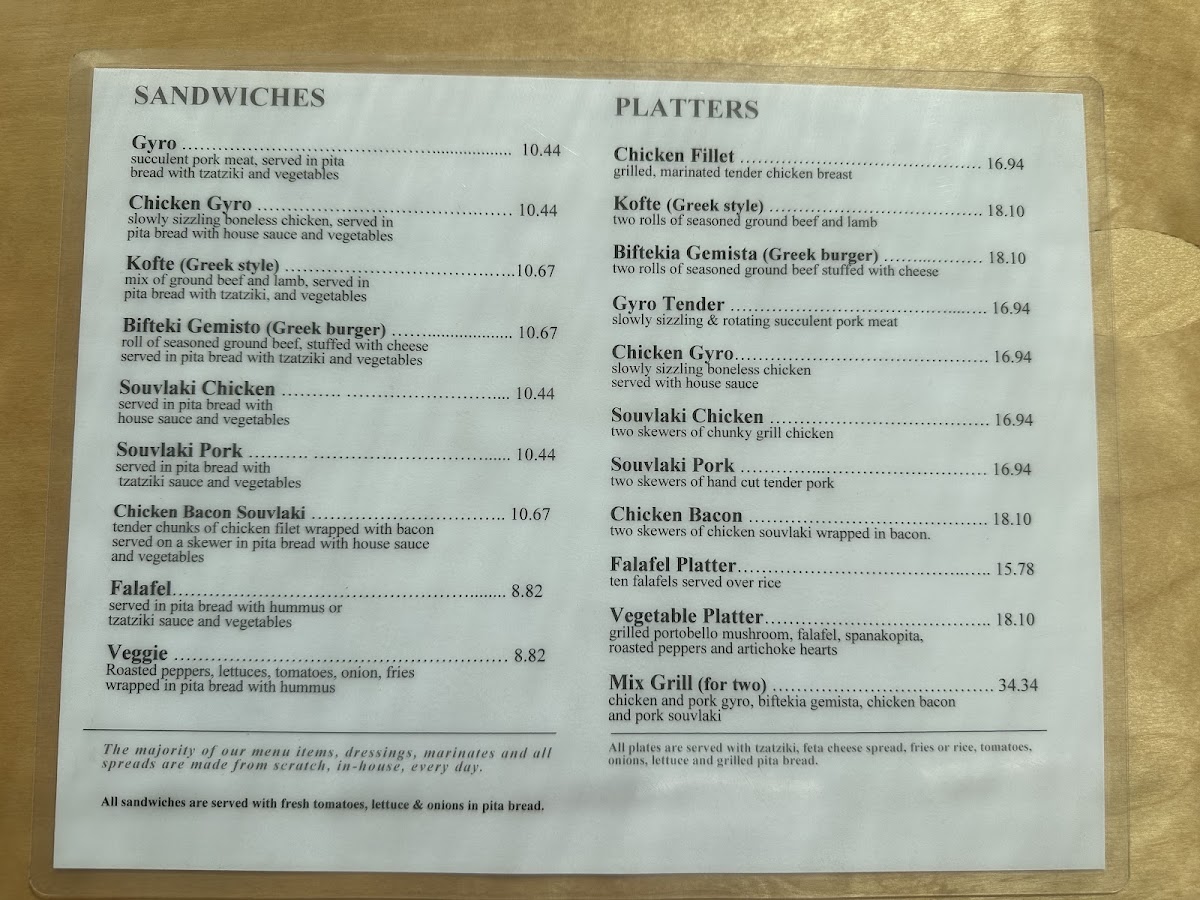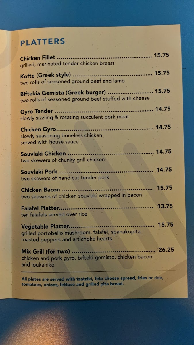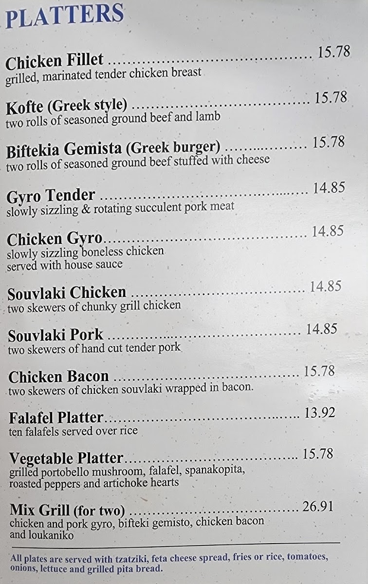 Chicken and pork gyro, biftekia gemista, chicken bacon, and pork souvlaki served with your choice of rice or french fries, two pita breads, fresh vegetables, feta, and a spread of tzatziki
