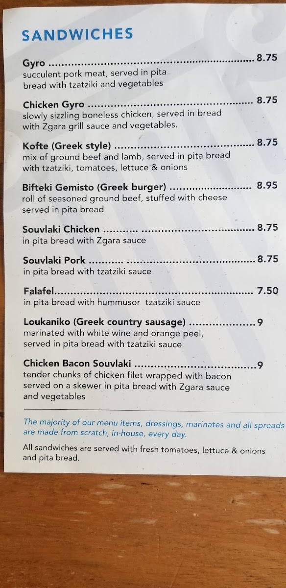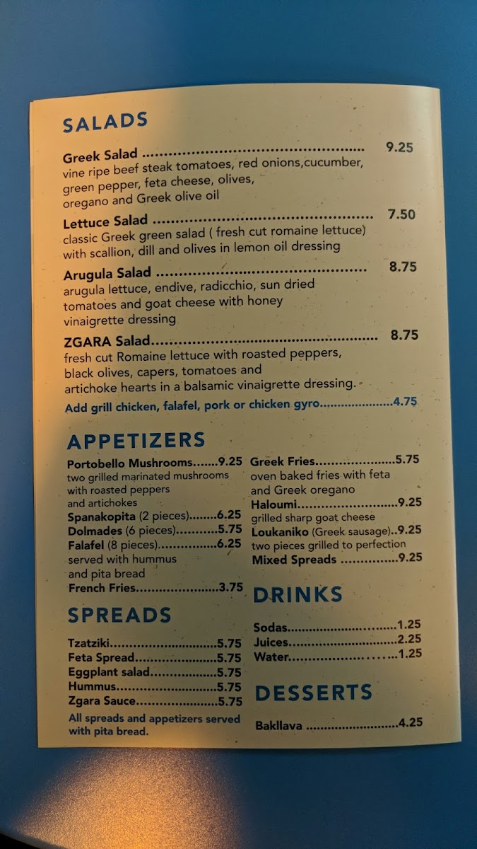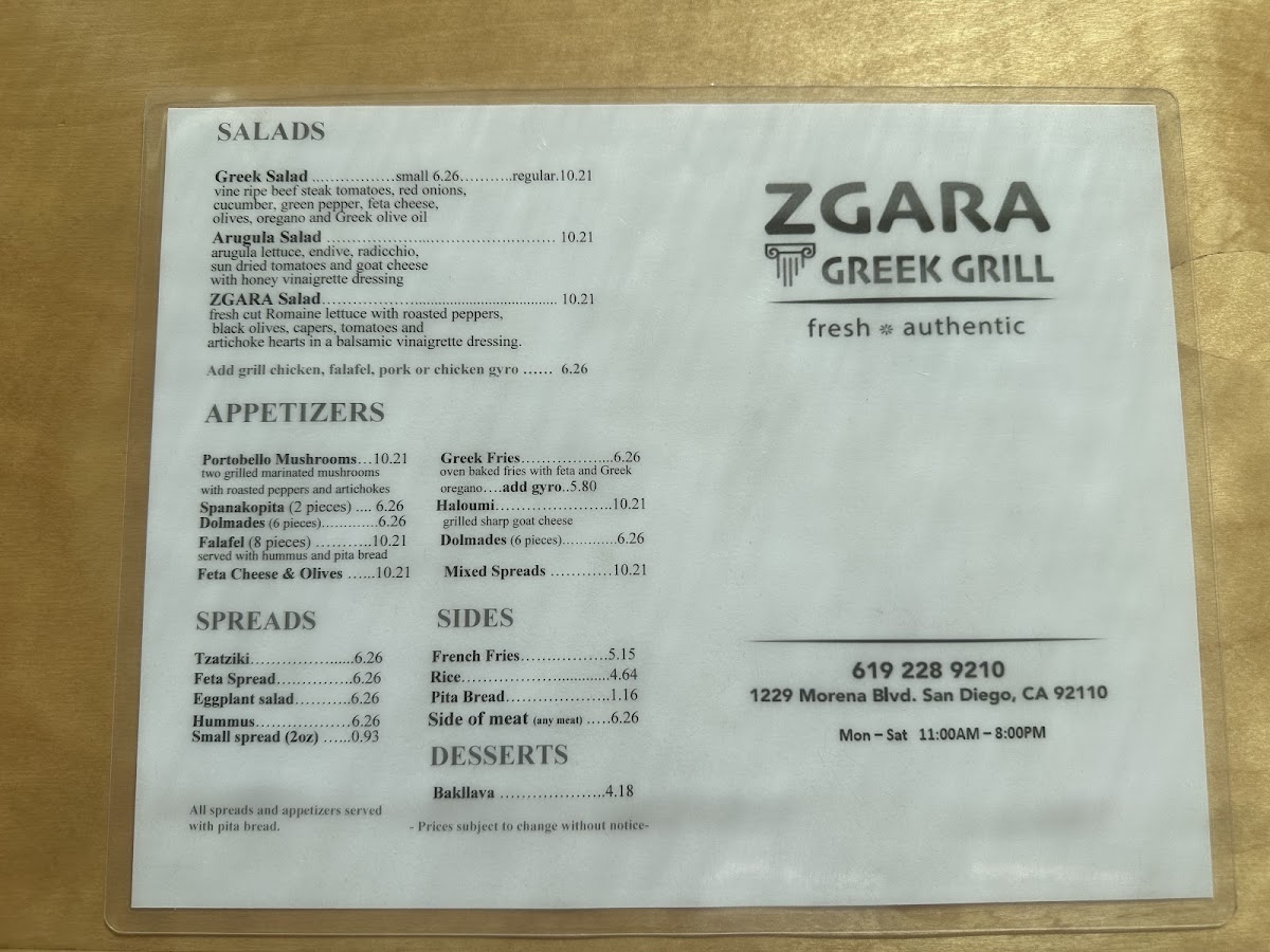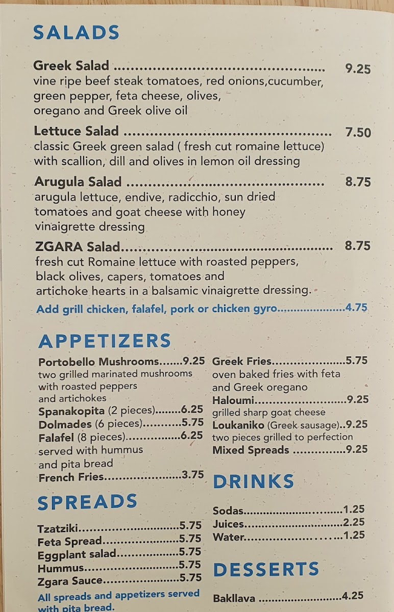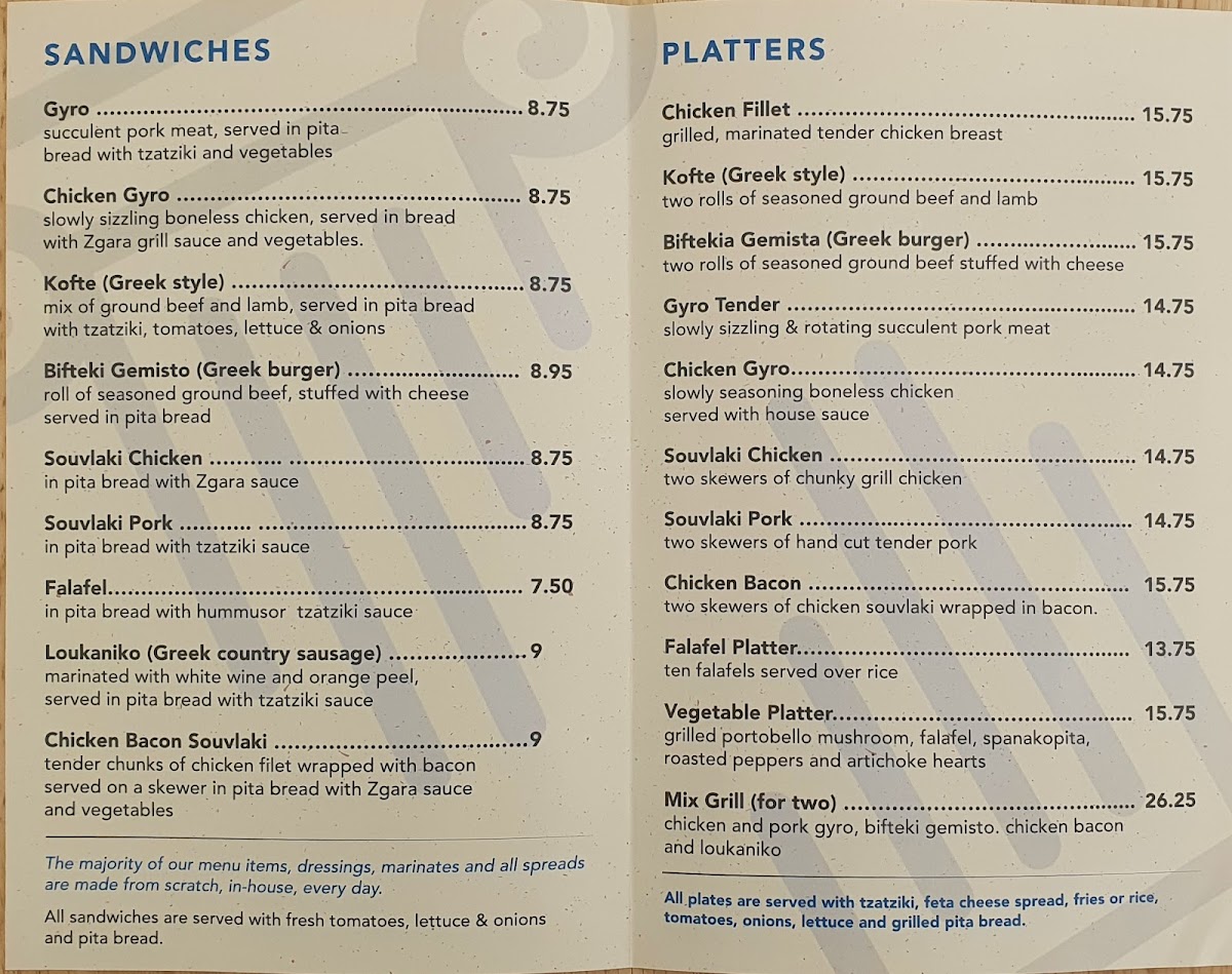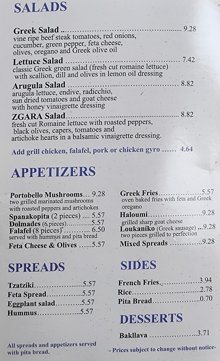From a reviewer’s perspective, the menu at Zgara Greek Grill delivers a well-rounded snapshot of Greek comfort food, thoughtfully organized to suit different times of day and appetites. It begins on a fresh note with salads like the Greek Salad - Small, Greek Salad - Regular, and the house-forward Zgara Salad, setting a clean, Mediterranean tone. For daytime diners, the #1 Lunch Special and #2 Lunch Special (available before 4PM) offer a convenient way to enjoy classic flavors, while the evening #1 Combo and #2 Combo (after 4PM) feel ideal for heartier cravings. Sandwich lovers are well covered with staples such as Gyro (SW), Kofte (SW), Falafel (SW), Chicken Bacon (SW), and Pork Souvlaki (SW)-each reflecting traditional Greek street-food roots. The supporting menu shines with spreads like Hummus Spread 8oz, Tzatziki Spread 8oz, and Feta Spread 8oz, complemented by practical sides including Side Meat - Chicken Fillet, Rice - Side, Side Meat - Chicken Souvlaki, Side Meat - Biftekia Gemista, and Extra Sauce - Feta Spread 2 Oz. Appetizers such as Portobello (AP), Dolmades (AP), Feta Cheese & Olives Appetizer, Mix Spreads App, and Greek Fries are perfect for sharing, while platters like Chicken Bacon (PL), Vegetable (PL), Kofte (PL), Gyro Tender (PL), and Mixed Grill (PL) showcase the kitchen’s range. To round things out, drinks from Bot Drink to Can Soda - Diet Coke, Water, Gatorade - Blue, and Snapple Tea - Raspberry keep it casual, and desserts like Baklava and Greek Yogurt provide a satisfying, traditional finish. Overall, the menu feels cohesive, familiar, and comforting-an inviting summary of Greek flavors done with simplicity and balance.